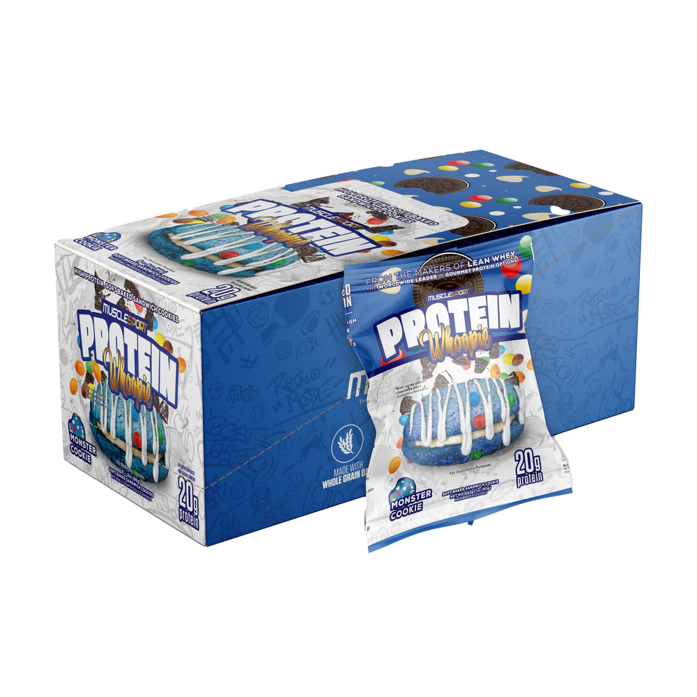 Protein Whoopies 6-Pack de MuscleSport® ofrece los sabores Monster Cookie, Protella y Oatmeal Chocolate Chip, con 20 g de proteína.